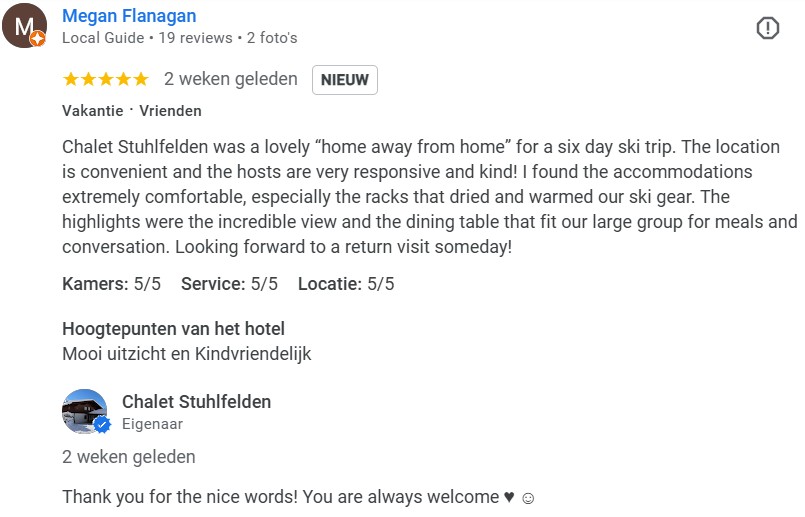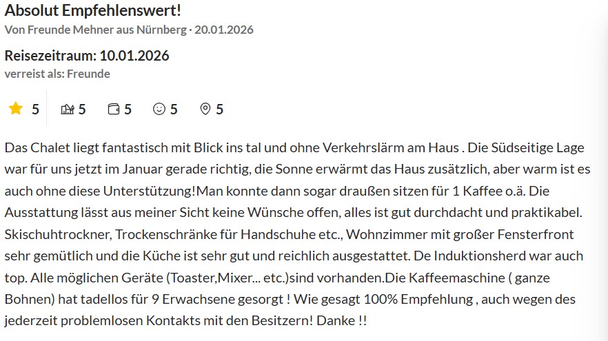 Chalet Stuhlfelden exists on various booking platforms and Google, where our guests have generously shared their experiences through insightful reviews. Below, find screenshots capturing the essence of our latest 10 reviews. Delve into the firsthand accounts of our guests!